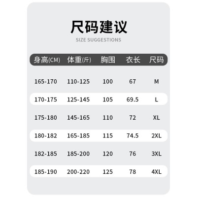 尺码M【建议100-125斤左右】,L【建议125-145斤左右】,XL【建议145-165斤左右】,2XL【建议156-185斤左右】,3XL【建议185-200斤左右】,4XL【建议200-220斤左右】袖型常规