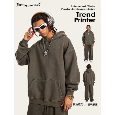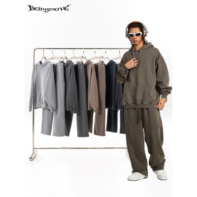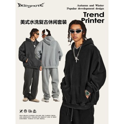 秋冬美式潮牌高品质宽松基础款复古水洗加绒卫衣休闲套装男