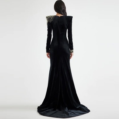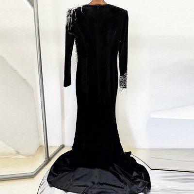品质现货晚礼服 2025明星系列重工钉珠醋酸丝绒小拖尾长裙连衣裙