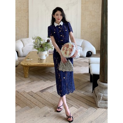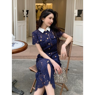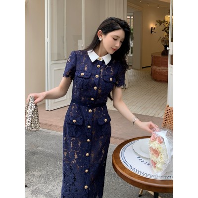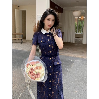 新款女装深蓝色蕾丝花边拼接复古小香风撞色翻领短袖长裙连衣裙子