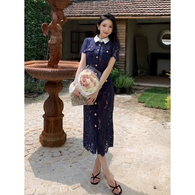 首页 > 男装 / 女装 / 内衣 > 女装 > 蕾丝/雪纺衫 > 新款女装深蓝色蕾丝花边拼接复古小香风撞色翻领短袖长裙连衣裙子